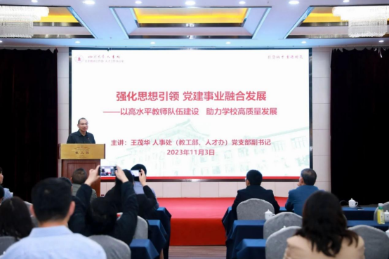 人事处(教工部、人才办)人才交流中心主任王茂华以“强化思想引领 党建事业融合发展——以高水平教师队伍建设,助力公司高质量发展”为题,结合党的二十大报告精神、公司党委九届二次全委会决定和下半年重点工作,就人事处(教工部、人才办)党支部在师德师风建设、人事制度改革等方面如何发挥党建引领作用进行了解读。