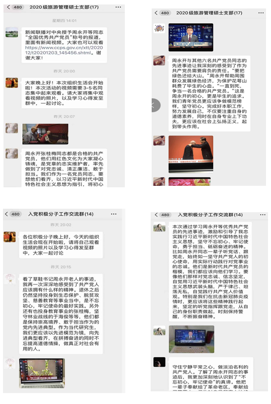 12月26日,太阳成集团tyc33455cc(旅游公司·)2020级硕士二支部何玉霞书记组织党支部全体员工党员、入党积极分子以“线下自主学习文字材料+线下组队观看视频材料+线上讨论发言”的形式,学习周永开等7名同志先进事迹,巩固和深化“不忘初心,牢记使命”主题教育成果。倡议支部全体党员、积极分子定期学习先进典型事迹,营造向先进学习、崇尚先进的浓厚氛围,充分发挥先进典型的示范引领作用。