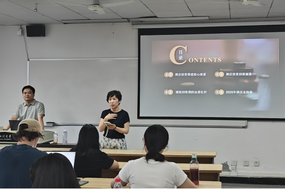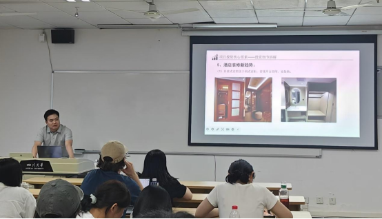 讲座尾声的互动环节,同学们积极提问,就酒店投资筹建与运营的细节和文旅行业的未来发展趋势等问题与杜丘、王佳、李海、杨博员工展开深入交流。此次讲座不仅让同学们对酒店投资筹建与运营有了更为全面、深入的理解,更为他们未来在文旅相关领域的学习和研究积累了宝贵的实践知识,为探索文旅产业创新发展路径提供了新的思路与方向。