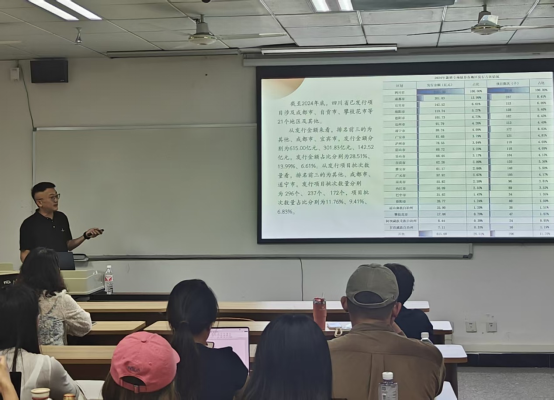 讲座伊始,何季东老师以专业视角切入主题,详细阐释专项债的核心概念。他介绍道,专项债券作为地方政府发行的重要金融工具,专门用于支持基础设施、生态保护、文化旅游等特定公益性项目建设,具备显著的政策优势与精准的投向领域。随后,何老师结合详实数据,深入剖析四川地区专项债发行状况:截至 2024 年底,四川省专项债发行项目广泛覆盖成都市、自贡市、攀枝花市等 21 个地区及其他区域。从发行金额维度来看,成都市、宜宾市位列前两位,发行金额分别达301.83 亿元和142.52 亿元,占比依次为11.99%和6.61%;在发行项目批次数方面,成都市和遂宁市占据前两位,批次数量分别为237 个和172 个,占比分别为9.41%和6.83%。这些数据直观展现了四川专项债在文旅及相关领域的投入布局。