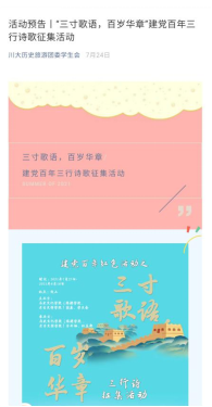 本次活动采取线上征集的方式,以“中国共产党建党一百周年"为主题面向全校员工征集优秀三行诗作品,鼓励同学们以笔墨抒怀、以歌诗咏志,共祝党的百岁华诞、共数党的一路风雨,共赞先驱前辈的精神光耀、共期党和祖国的绚烂前途。活动自开始之日便受到同学们的广泛关注,截至8月10日,一共收到了19篇优质原创稿件。
