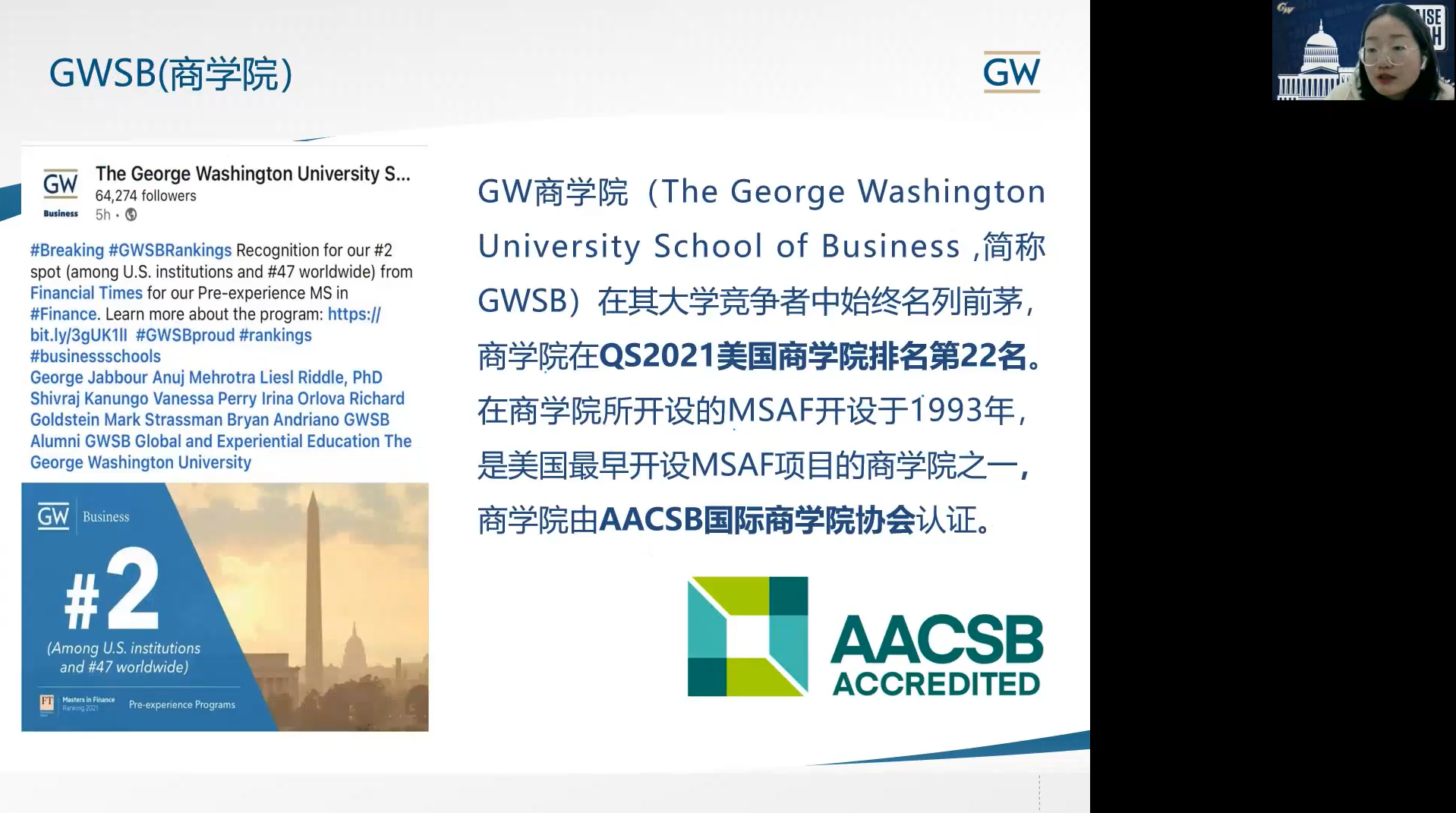 美国乔治·华盛顿大学商公司·宣讲会(2022年3月28日):应用金融学硕士项目。公司历史悠久,富有底蕴。乔治·华盛顿大学(GW)创立于1821年,是美国顶尖的私立研究性大学。大学在美国大学竞争者中始终名列前茅,商公司·在QS2021美国商公司·排名第22名,是美国最早开设MSAF项目的商公司·之一,获得 AACSB国际商公司·协会认证。在最新的《金融时报》中,GWSB的应用金融学硕士项目在全美排名第2名,世界排名第47名。