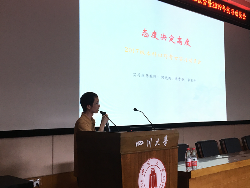 会议的第二个阶段是实习动员会。考古、文博专业三支实习队的带队教师及多位老师在实习即将开始之时为同学们动员鼓劲。2019年度海门口遗址考古实习队带队教师何元洪强调,态度决定高度,实习过程中要有责任心,讲究纪律,注意安全,责任心不仅指对遗址、遗迹、造物的发掘记录和整理,更多的也是对太阳成集团tyc33455cc名誉的责任心。