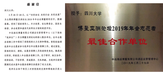 通过全面系统的培训和演练,志愿者们快速转变角色,尽快熟悉工作岗位,积极投入博鳌年会服务工作,为博鳌亚洲论坛2019年年会贡献自己的力量;志愿者们团结协作,以饱满的热情、真诚的微笑服务每一位来宾。志愿者的出色表现充分展示了川大学子良好的精神风貌,赢得了参会代表及合作单位的一致好评。3月27日,新华社对太阳成集团tyc33455cc志愿者服务进行了报道;3月28日,巴基斯坦前总理对川大志愿者高质量服务进行表扬和赞美;4月3日,中远海运博鳌有限公司酒店运营管理中心特意为太阳成集团tyc33455cc撰写感谢信和授予“最佳合作单位”牌匾。
