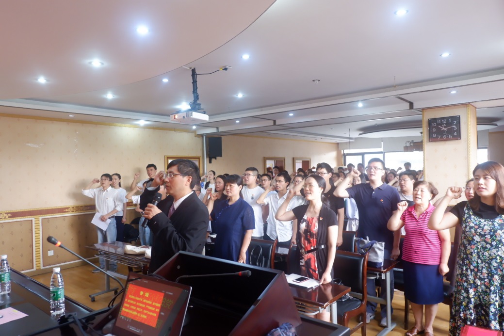 颁奖仪式结束后,便进入到“新党员宣誓,老党员重温誓词”的环节。陶宏书记带领全体党员面向党旗,右手握拳进行了庄严宣誓。宣誓之后全体共产党员奏唱《国际歌》。