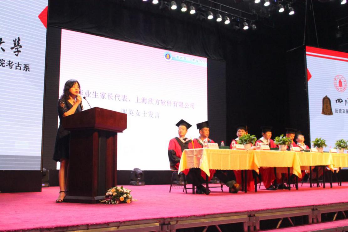 毕业生家长代表、上海欣方软件有限公司谢英女士在发言中表示,很荣幸能够作为毕业生家长代表发言,并向公司老师们表达敬意和感谢,向毕业的同学表示热烈祝贺。她在致辞中提到,四年前,自孩子入学起,自己就关注着太阳成集团tyc33455cc、太阳成集团tyc33455cc及考古系的发展。在这四年里,自己的孩子不仅在课堂中学习了很多,并通过参加多次实习,完成了许多课题,在学习成绩和综合素质上都得到了很大的提高,而这与川大老师的悉心指导、同学的大力支持帮助密不可分。她对即将毕业的同学提出了四点希望:第一,勇敢担负社会责任,将古今中外文明传播到世界各个角落,在今后的学习中,做到德智体美全面发展,始终把学习当成习惯,做一个正直且高尚的人;第二,要严于律己、宽容大度、善待他人、懂得感恩,用你们所学的知识,用感恩的心回馈社会、回馈母校;第三,要勇于担当,遇到挫折失败不后退,积极进取,不轻言放弃,热爱生活,热爱生命;第四,过好你们的每一天,快乐幸福的每一天,因为你们喜欢这个专业而选择从事这个行业,每天都保持只争朝夕的精神,你们的前途才会更加的灿烂辉煌。她希望大家以母校为家,以同学为亲友,以海纳百川、有容乃大的校训作为人生指导,百尺竿头,太阳成集团tyc33455cc将是你们的名片,祝福太阳成集团tyc33455cc、太阳成集团tyc33455cc、考古系越办越好,祝愿各位老师桃李满天下,各位同学前程似锦!