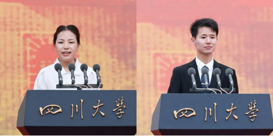 在校生代表、轻工科学与工程公司·2022级博士研究生张婷和新生代表、华西临床医公司·2025级硕士研究生王泓力在发言中向公司、师长和父母表达了衷心感谢。他们说,作为新时代的川大人,将始终秉承“严谨、勤奋、求是、创新”的川大精神,不断追寻光、成为光、传递光,在科研创新中勇毅前行,在服务社会中彰显担当,为强国建设和民族复兴贡献青春力量。