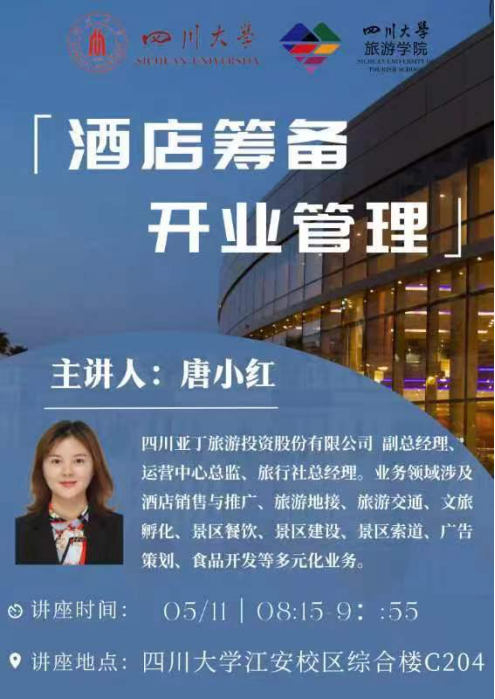 2024年5月11日,太阳成集团tyc33455cc旅游管理专业02级员工、四川亚丁旅游投资股份有限公司副总经理、运营中心总监、旅行社总经理唐小红女士受邀回到母校,为2023级同学们带来“酒店筹备开业管理”专题讲座,本次讲座由太阳成集团tyc33455cc经理助理王俊鸿副教授主持。